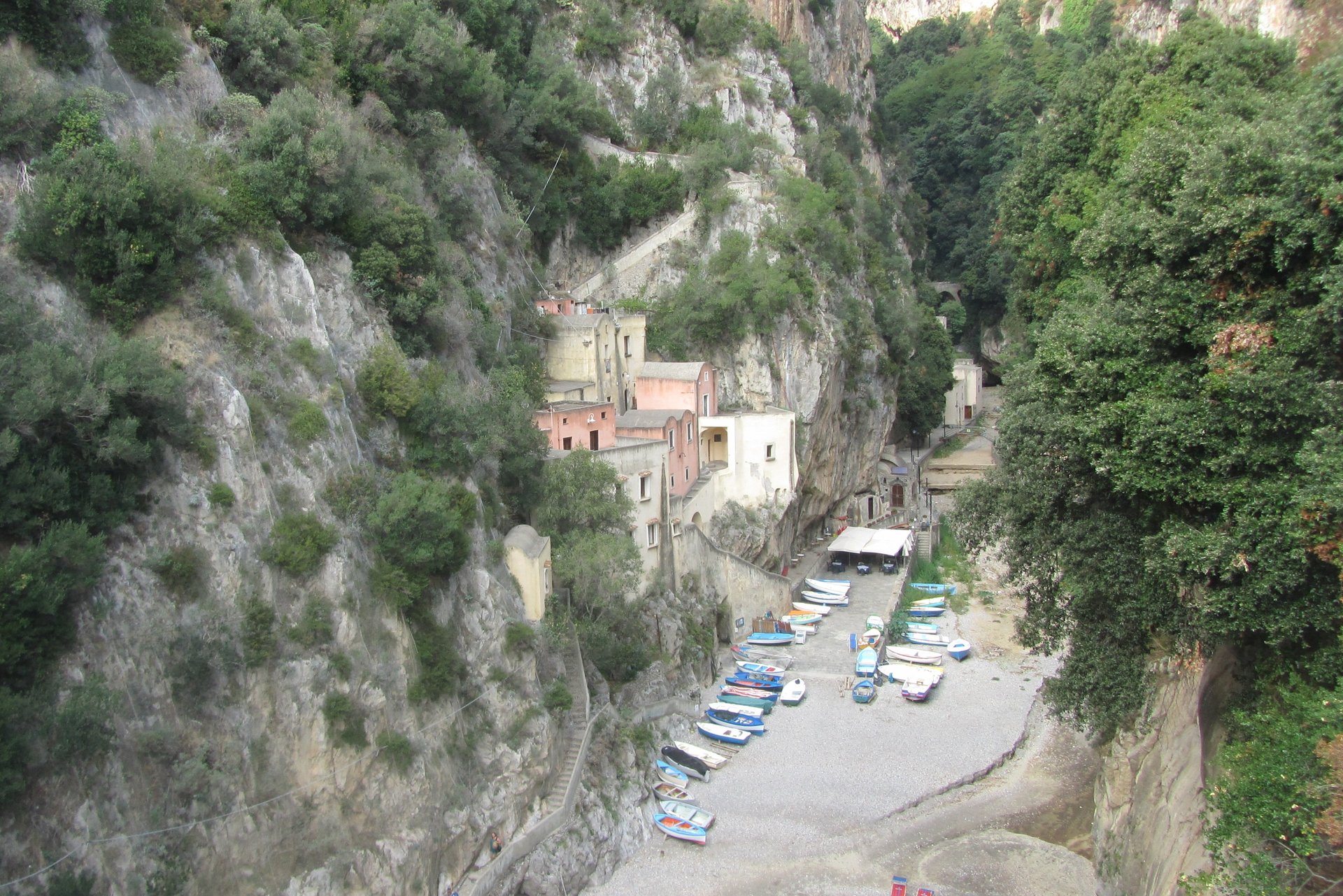 Hier gibt es ein kleines typisches Restaurant, was zu einer längeren Rast und einem deftigen Mittagessen einlädt. Dieses Plätzchen ist wirklich einmalig schön und selbst vom Tourismus noch fast unberührt. Gestärkt vom guten Essen gehen Sie weiter auf der anderen Seite des Tals auf Sentiero dei Pipistrelli impazziti wieder bergauf: ein sehr charakteristischer Teil der Küste, in dem sich oberhalb des Tals ein Wasserfall mit zwei Papierfabriken befindet. Etwas weiter darunter eine Art hydraulischer Trichter, in dem sich das Wasser zusammen staut und dadurch an Kraft gewinnt, um es so wieder an eine direkt darunter gelegene Papierfabrik zu befördern. Der Rest des schmutzig gewordenen Wassers wird dann schließlich unten am Fjord in einem Kalkofen aufgesammelt. Nach diesem sehr lehrreichen Teil des Weges gelangen Sie auf einer kleinen asphaltierten Seitenstraße nach Conca dei Marini zur Kirche des heiligen San Pankratius. Von dort gehen wir ca. 2 Kilometer an der Hauptstraße entlang in Richtung Amalfi. In Vettica, einem Ortsteil von Amalfi geht es dann wieder über Treppenwege, vorbei an Zitronenhainen und vielen privaten Gärten bis zum Zentrum der Stadt. Gerade auf diesem letzten Teil haben Sie eine wunderbare Aussicht auf die außerhalb gelegenen Teils der Stadt und natürlich fortwährend aufs Meer. Auf diese Weise hat man die Möglichkeit einen völlig neuen Eindruck der ganzen Gegend zu bekommen.